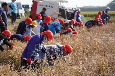 慣れてくると、じょうずに鎌をつかって稲を刈り、積み上げていきました。
