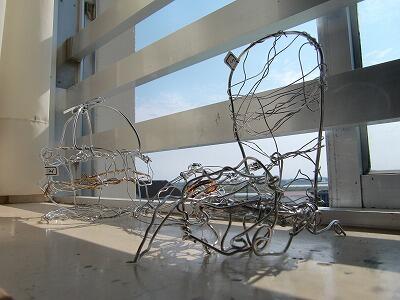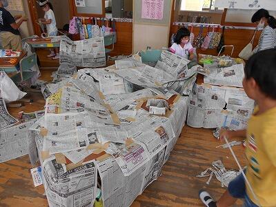 子ども達は、机やいすをくっつけたり重ねたりして土台を作った上に、新聞紙やビニールをまいて包みました。