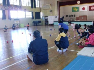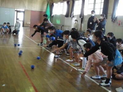 児湯るぴなす支援学校の紹介ビデオを見たり障がい者スポーツのひとつである『ボッチャ』を体験したりしました。初めて体験するボッチャに、子ども達はとても興味をもって取り組み、障がいのある方たちともできるスポーツがあるということを知ることができました。