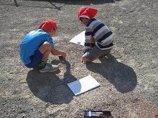 虫めがねを使って太陽の光を集めています。うまくできるかな?