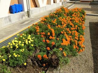 校舎南側の学級園に、秋色のマリーゴールドが咲いています。