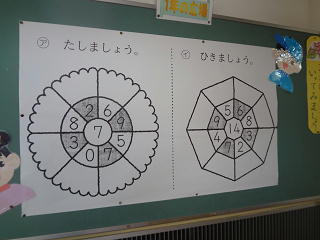 算数の学習内容が掲示してあります。時折、1年生が立ち止り、問題を解く姿が見られます。