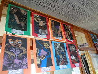 2学期に完成した版画が掲示してあります。生き生きとした表現の作品の数々です。