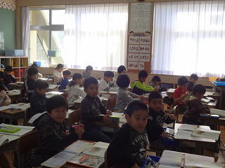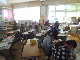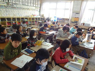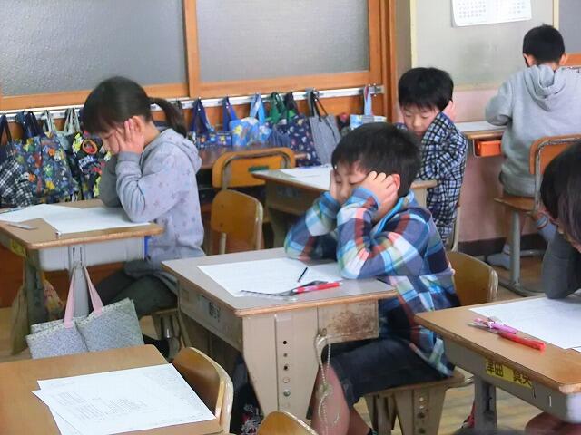 国語の時間に、3年生はお話の読み取りの勉強をしました。みんな真剣にがんばっていました。耳を押さえて、集中して読んでいます。