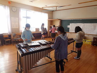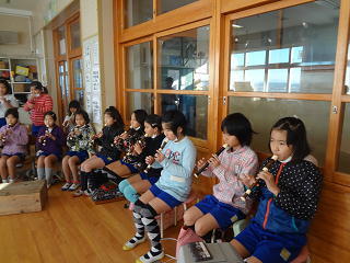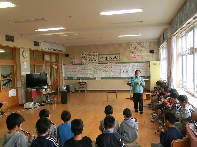 3年生の音楽の時間です。今日はリコーダーの練習です。リコーダーを通して先生と児童が会話しているようでした。