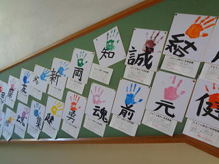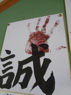 今年の抱負を一文字で・・・。自分の手形を添えて・・・。今度の参観日にじっくりごらんください。