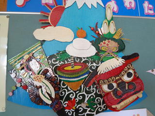 新年をお祝いする日本ならではのお正月の風景が掲示してあります。・・・・「皆様にとりまして、健康で幸せな年でありますように・・・」の願いが込められているように思えます。
