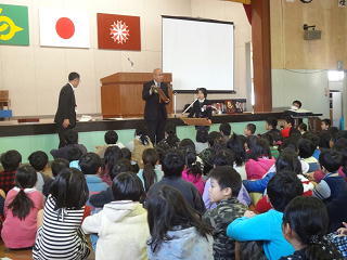 みんなで新年のあいさつを行い、児童は、校長先生の「1年の計は元旦にあり・・・」等のお話に熱心に耳を傾けていました。