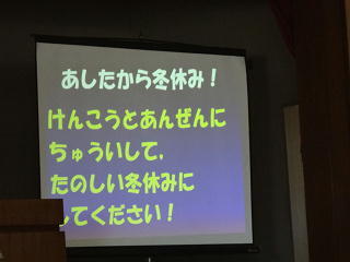 2学期をふり返り、頑張った人へ・・・さまざまな表彰が行われたり・・・冬休みのすごし方について、みんなで考えたり・・・。最後に先生から通知表が一人一人に手渡されていました。