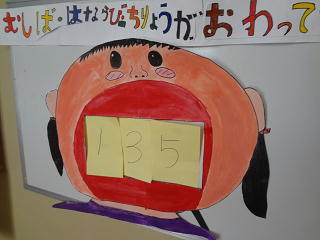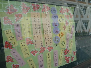 プール前掲示板には、子どもたちの考えた「たのしみ」が掲げてありますよ。「おもち」「こたつ」・・「マラソン」・・・・。楽しんで下さいね。