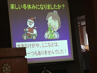 始業式の後、生徒指導の先生から、冬休みのふり返りや3学期のすごし方等のお話がありました。みんな真剣に耳を傾けていましたよ。