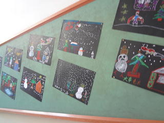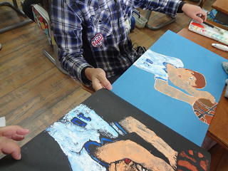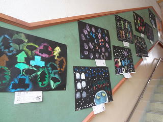 出来上がった作品が東階段に展示してあります。おもしろい手法で楽しくて素敵な作品ができました。