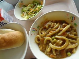 今日の給食の米粉パンとカレーうどん・・・新富町産の米と小麦で作られたものです。おいしくいただきました。