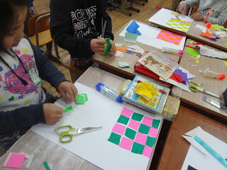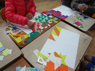 いろんな図形を組み合わせて作品を作っていました。算数?図工?コラボ作品ですね。