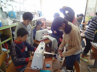 学校支援ボランティアの方々のサポートを受けながら、ミシンを使ったエプロン制作を行っていました。