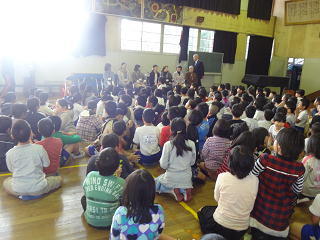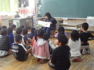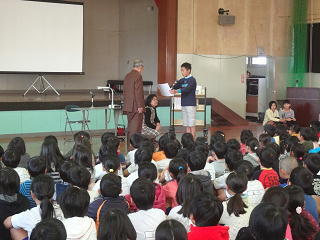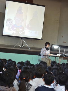 読書感謝集会では、「ぶーふーうー」のみなさんによる読み聞かせも行われました。みんなじっと耳と目と心を傾けていました。
