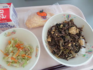 ビビンバ丼、ツナサラダ、そしてみかんクレープでした。