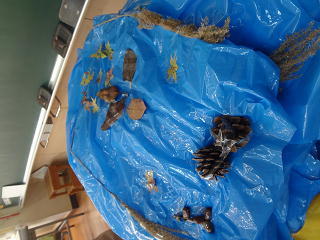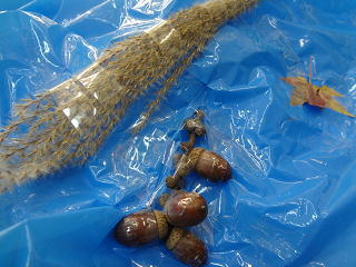 1年生は公園などで見つけた、それぞれの「秋」で洋服を作っていますよ。昨日の参観日でファッションショーを行ったそうですよ。