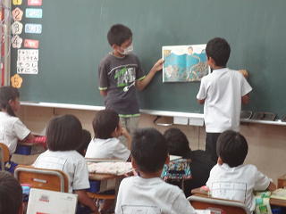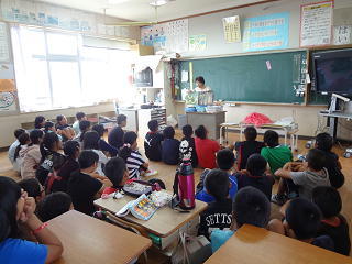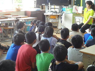 お隣のクラスの先生がお話・・・。6年生はなんだか、新鮮で楽しげな雰囲気に包まれていました。