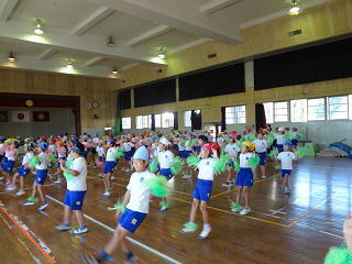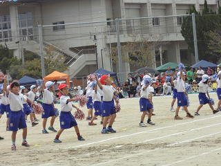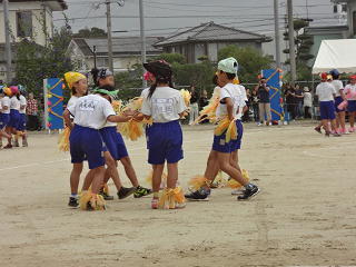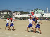 バンダナを結び、手足にボンボン・・・楽しいフォークダンスメドレー・・・。ボンボンもゆれて、観客席でもこどもの楽しい動きに踊りだす人も・・・たくさん見受けられました。ウキウキ気分のダンスをみんなに伝え、上手にリズミカルな踊りでした。