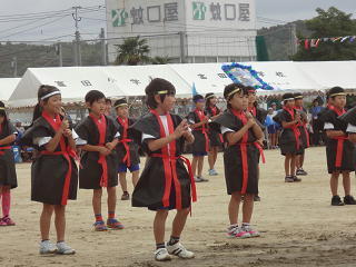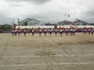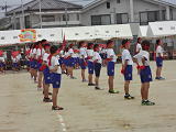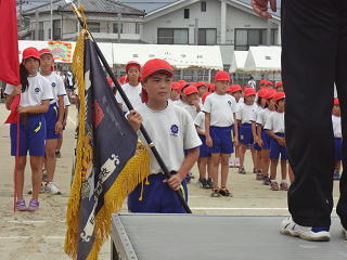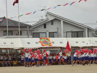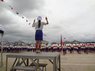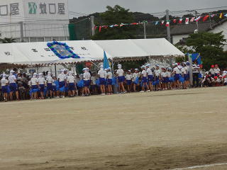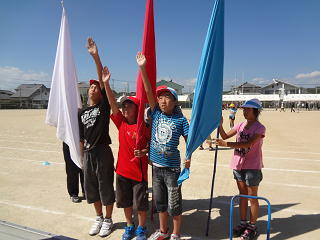 副団長が旗を掲げる中、団長による堂々の選手宣誓!すばらしい宣誓でした。そして6年生代表の指揮で全校みんなで運動会の歌・・・・。大きな声が響き、運動場は子供たちのパワーに包まれていきました。