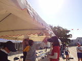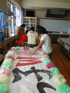 スローガンにビニールをかけたり、装飾をほどこしたり・・・。黙々と行っていました。メンバーがひとつになっている瞬間のようでした。