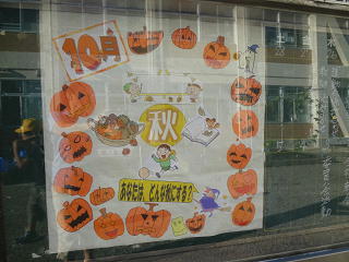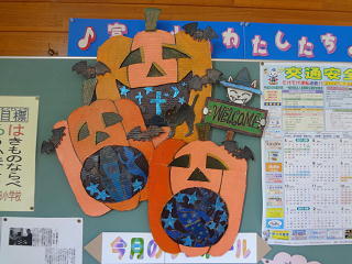 校長室前の掲示板には、こんなゆかいな、かぼちゃの仲間たちが登場!口の中には、しあわせを呼ぶ何かが・・・入ってますね!