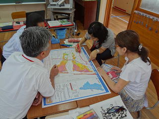 安全教育の一環で新富町の地図を広げ、地形を把握したり、避難経路や地域の特徴などについてみんなで話し合ったりしました。
