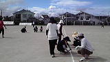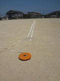 2学期からの運動会の練習に備えて、職員がポイント打ちの準備を進めています。