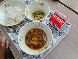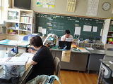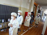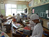 2学期はじめの給食・・・・。当番の児童が洗いたての給食着を身に付け、なれた手つきで配膳していました。