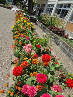 職員による水やりで学校はさわやかに始まります。学校園の花も水をもらって嬉しそう・・・。連日の猛暑をもろともせず、咲き誇っています。