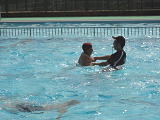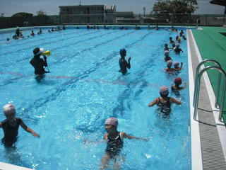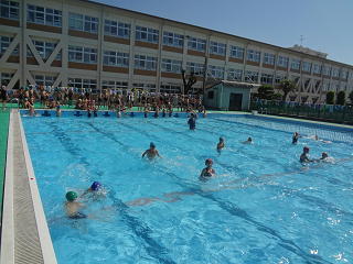 プールの水位を下げて、いつも上学年が使っているエリアで活動しました。いつも見てるだけの広いエリアに大喜び!