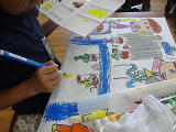 クレヨンで描いた絵のまわりや背景に、水性絵の具を塗る学習を行っていました。