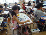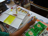 道具を準備し、水を汲むところから・・・、復習して・・・、いよいよ色を塗ります。パレットやふでの使い方など、随分慣れてきたように感じます。
