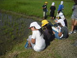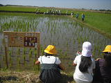水田に行き、稲の成長の様子を観察しました。先生方に立てていただいた看板の前にも集まり、嬉しそうに見ていました。