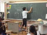 今日は、3年生の学級で、アメリカから夏休みを利用して来日した女の子とそのご両親が、日本の学校を体験されました。