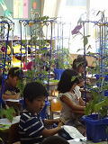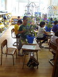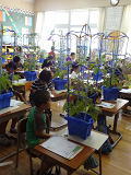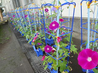 自分たちでタネをまいて育てたアサガオが花をさかせました。