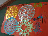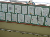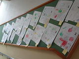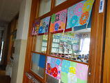 さまざまな模様の作品が廊下や掲示板に展示してあります。参観日にゆっくりご覧ください。