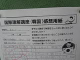 「韓国の学校は毎日のようにキムチがでることに驚きました。」「サッカーやドッチボールで遊ぶのは一緒だな・・・」「韓国のことをもっと知りたくなりました。」等・・・、子供の気持ちが表現されています。