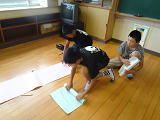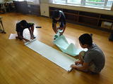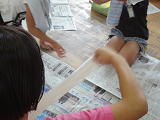 「大きな紙」を新聞紙をつなぎ合わせて作り、いろんなものを作成していました。トンネル・・・、建物・・・、思い思いの考えでチャレンジ!