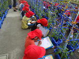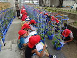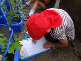 自分たちがタネをまいてお世話しているアサガオ・・・。花が咲き始めています。今日は、その様子を観察して記録をしていました。目を輝かせての観察でした。