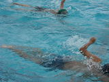 ビート板をつかって、足を使わず、手での「かき」を学んだりして技術の向上も目指していました。先生方も熱い指導を展開!
