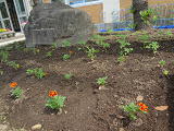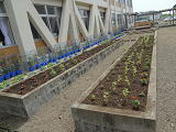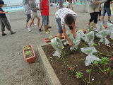 先日の奉仕作業で子供たちが、整えてくれた花壇に、たくさんの夏の花の苗が植えられました。