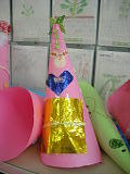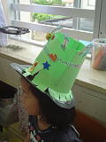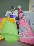 図工でぼうしを作りました。テーマはかぶって楽しいぼうしです。画用紙の丸め方に苦労しながらいろいろな材料(リボン、色紙など)を組み合わせて、かぶって楽しいぼうしを作りました。