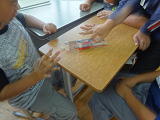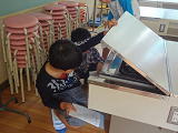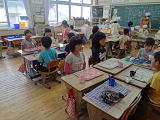 図工・科学クラブでは、特殊なビニールシートに絵を描き、それをトースターで加熱していました。6年生に相談したり、5年生が4年生を手伝ったりして、学年をこえた交流が進みました。