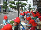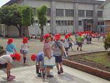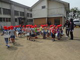2,3校時に1年生は、帽子をかぶり、水筒と探検バックをもって、学校の回りの探検に出発しました。何をみつけて帰ってくるでしょうか?