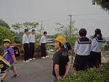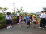 小学生は、大きく思えた中学生に親しみも感じているようです。中学生に見守られて、声をかけてもらって、嬉しさいっぱい!小学生も元気いっぱいにあいさつを交わしていました。
