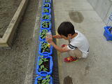 1年生が、毎朝お水をあげているアサガオ・・・。こんなにたくさん、芽がでてきましたよ。嬉しいですね。大切に育ててくださいね。