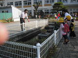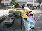 同時に、小学生にいろんな声をかけていただきました。低学年の児童も先生方と話ながら池をのぞいたり・・・、言葉を交わしたり・・・、小学生と先生方との交流もなごやか・・・。子供たちは嬉しくて・・・仕方なかったようです。