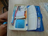 5年生になってはじまった家庭科の授業・・・、現在、針に糸を通して玉結び、波縫いの練習中です。